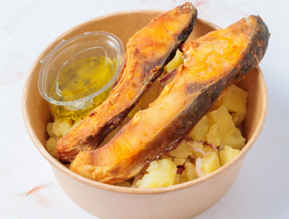 Riba stiže iz ribnjaka u Ruskom Krsturu sa protočnom vodom, što garantuje prirodan ukus i teksturu. Krompir dolazi iz Lalića — domaći i sezonski.
